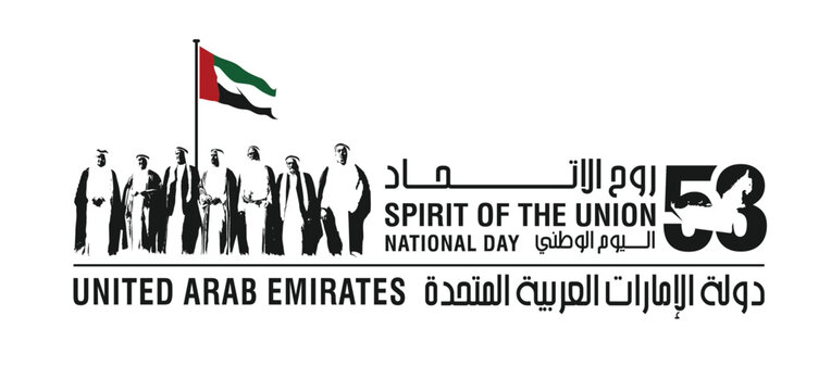 53 National Day of United Arab Emirates. Text Arabic Translation: Our National Day. December 2. UAE map symbol. Vector Logo. Eps 08.