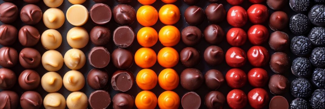 Assorted gourmet chocolates displayed for world chocolate day celebration. Top view. Horizontal banner. Copy space. Confectionery factory, sweet life
