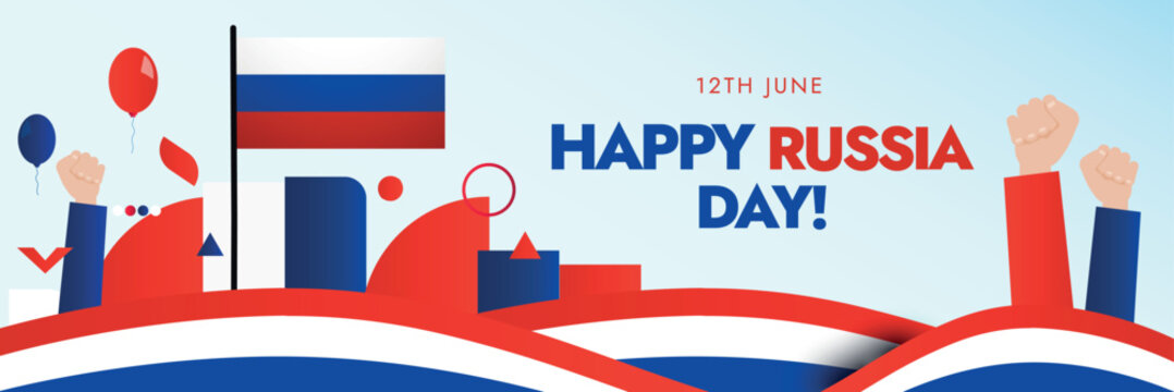 Happy Russia Day. Russian Independence day 12th June. Russia Day celebration social media cover or banner with modern curve elements, Russian flag, balloons, hand wrist in blue and red colours.