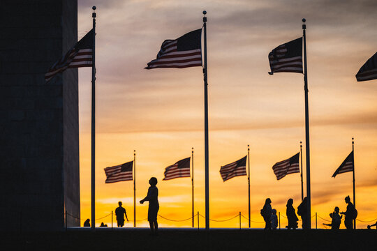 View of silhouetted figures stroll against a vibrant sunset beneath waving American flags, a solemn yet beautiful scene, Washington D.C., District of Columbia, USA.