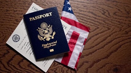 United States travel document and naturalization paperwork of nationality US banner over timber backdrop