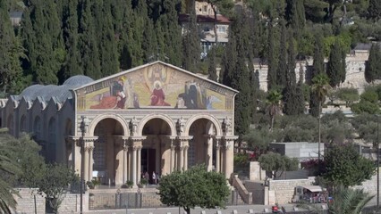 The Church of All Nations and the building of the Church of St. Mary Magdalene in the Gethsemane Garden of Jerusalem.