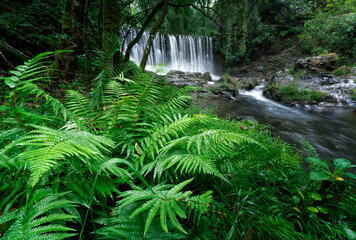 A breathtaking view of Svartifoss Waterfall in Iceland — cascading water plunges over dramatic dark basalt column cliffs, surrounded by lush green moss and rugged rock formations, capturing the natura