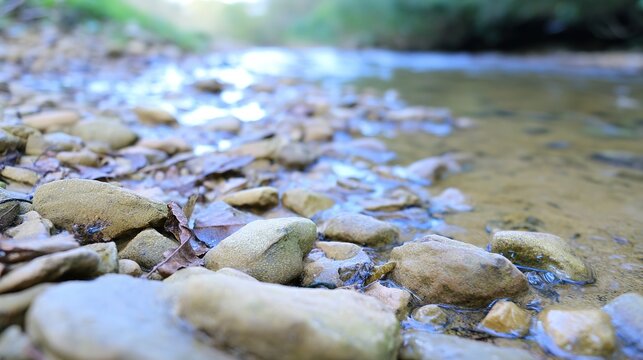 shallow. Smooth water-worn pebbles on a shallow stream bed with clear water flowing over them. travel magazines, destination branding, designed for travel destination branding.