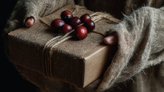 Rustic gift wrapped in fabric with coffee beans for natural packaging, handmade product or eco branding visuals