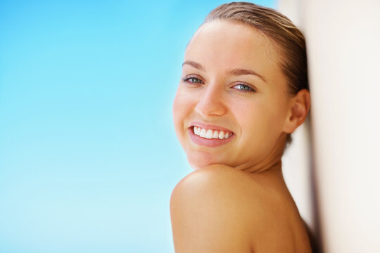 Skin care and women beauty. Young spa girl with clean body and natural facial tone, no makeup, touching her cheek and gazing at camera, advertising cosmetic product