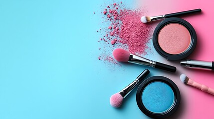 Elegant flat lay of skincare and makeup products placed on pastel surface, with half layout intentionally left blank for marketing text or brand identity design.