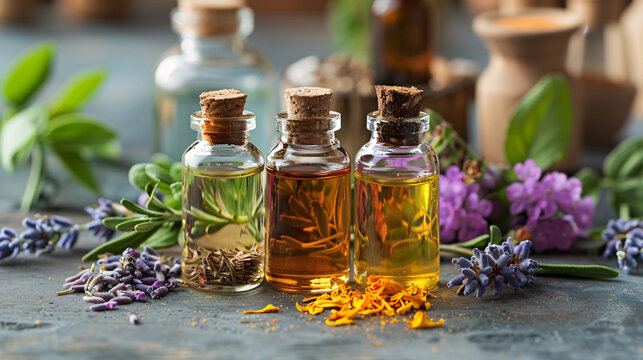 Colorful arrangement of essential oils in glass vials surrounded by fresh herbs and citrus fruits