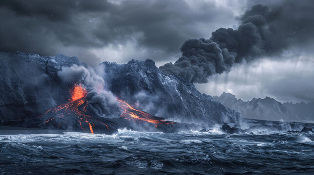 Dramatic Volcanic Eruption Near the Ocean with Molten Lava Flowing and Thick Smoke Under a Stormy Sky. Concept of Natural Disasters, Volcanic Activity, Ocean, Extreme Weather