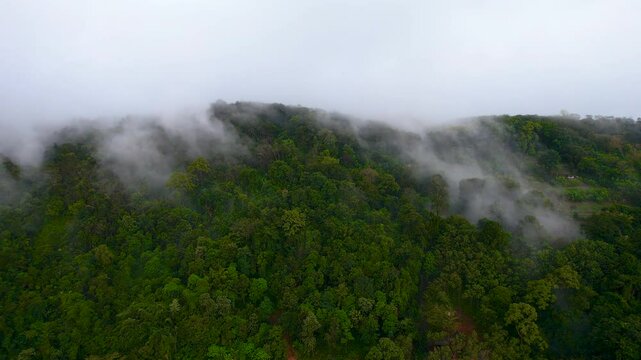 Fog rolling over lush tropical rainforest canopy