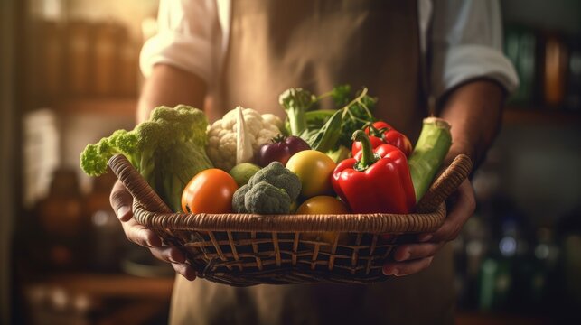 A local chef sourcing produce from the farmer�s market, holding a basket brimming with vegetables.