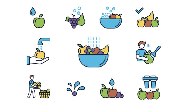 Washing fruits and produce icon set. Food safety and hygiene vector illustrations. Rinsing fresh fruit with water, cleaning in a bowl. Healthy food preparation concept.