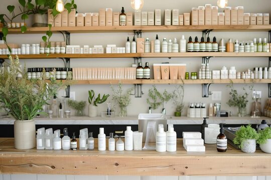 Ayurvedic products arranged on wood table with plants, herbs, spices in bowls. Earthy tones, natural light. Health, wellness, eco-friendly product background.
