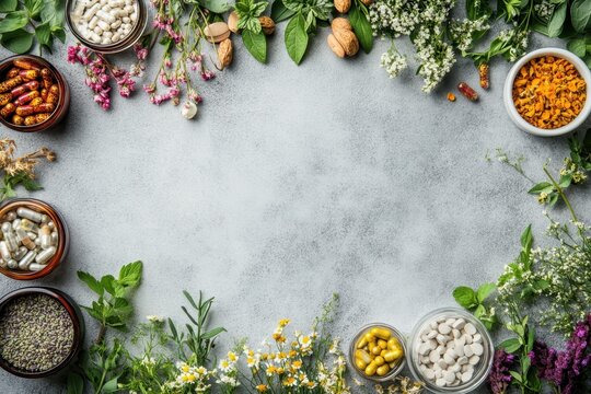 Herbal supplements and natural remedies on a gray background with plants and capsules