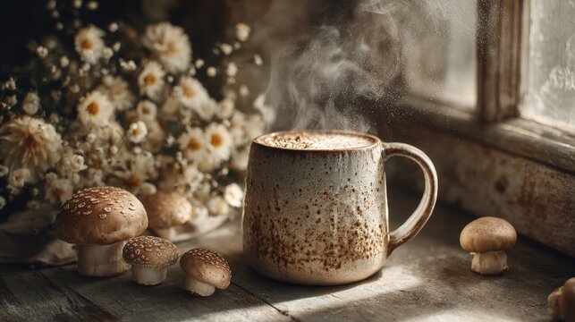 Wooden mug and rustic plant pot on a minimalistic design, creating a cozy, earthy vibe for natural decor.