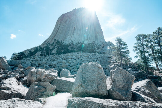 Devils Tower in the bright, early morning sunshine. Artistic filter applied