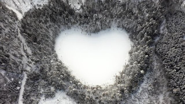 Heart shaped lake in winter forest. Tilting drone shot of natural snow wonder nature environment. Love peace save our planet symbol sign in Swedish woods. frozen pond water special shape Sweden