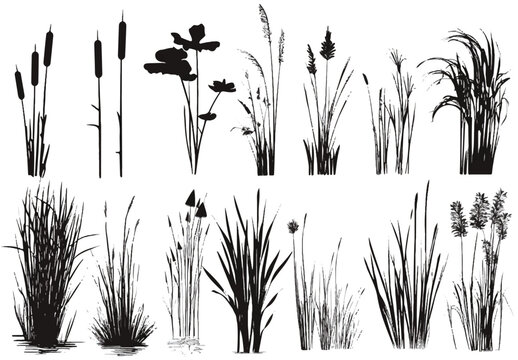 Silhouetted Botanical Illustration of Aquatic Plants and Grasses with Textural Details against a White Background