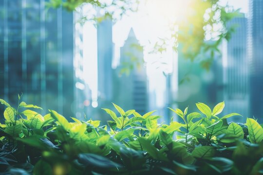 Corporate ESG reporting and nature awareness concept with green elements and business buildings. Copy space for text