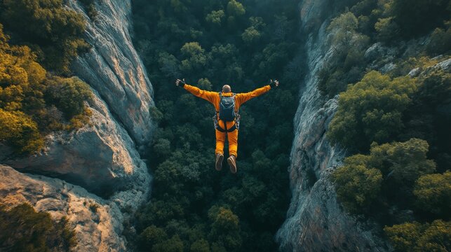 Man Base Jumping Off a Cliff into a Deep Forested Canyon