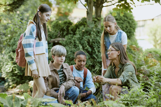 Group of diverse young adults hiking in lush tropical jungle with backpacks