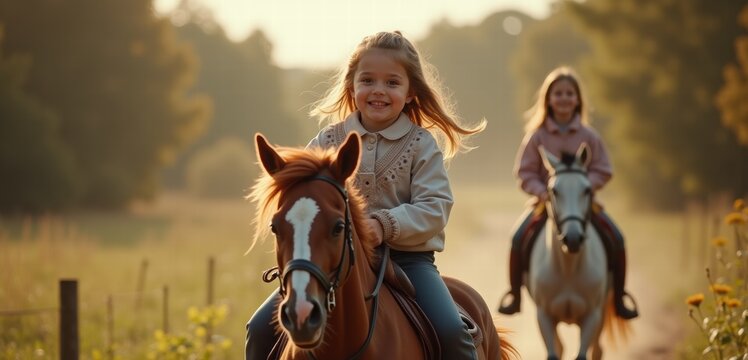 Joyful girls riding horses in a serene landscape at sunset, capturing the essence of childhood adventure and connection with nature.