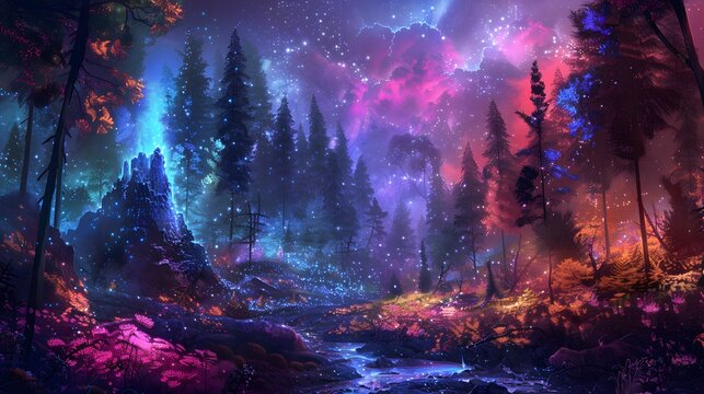A striking display of green digital code merges seamlessly with a tranquil forest environment, showcasing the intersection of nature and technology