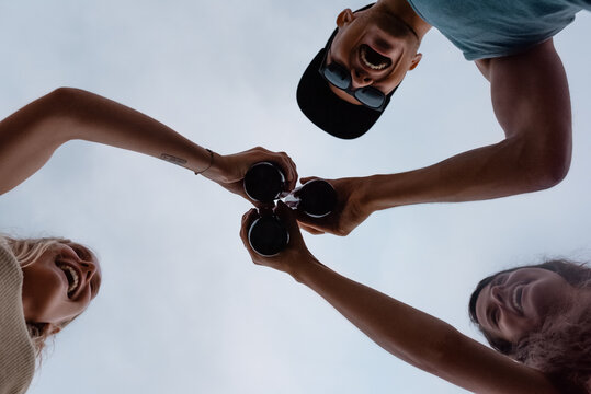 Group of friends having fun together, making a toast with glasses of rose wine at outdoor party on a sunny day