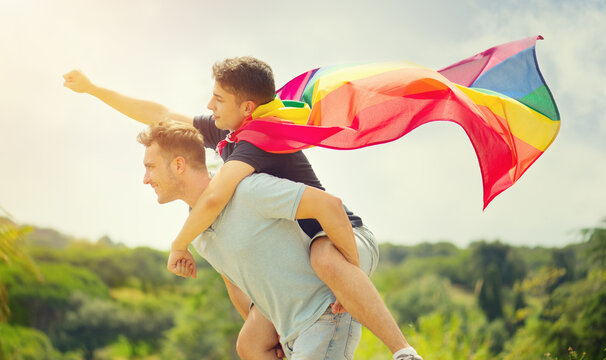 Happy young couple, gay family with flying LGBT rainbow flag having fun outdoors. Joyful gay men together in a park. laughing, hugging, enjoying nature outside, over sunny sky. Super hero. Piggyback.