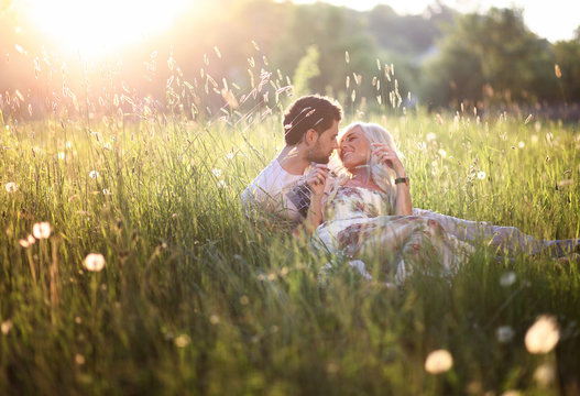 Young happy lovers sitting on meadow