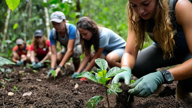 Focused children plant seeds in garden beds. Group of school students actively plant seedlings. Eco-friendly school project in nature. Youth learning about gardening. Teamwork, hands-on learning.