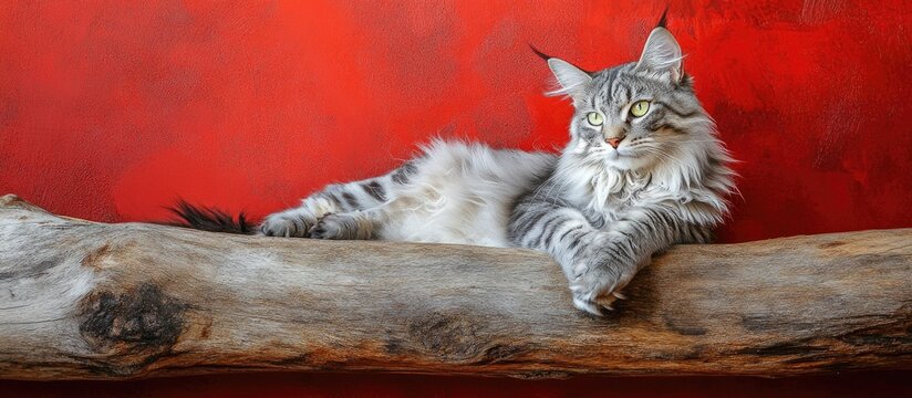 Silver tabby Maine Coon cat lounging on a wooden log against a vibrant red background perfect for pet related advertisements or promotions