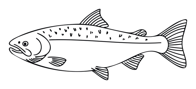 A minimalist outline drawing of a salmon fish with fins and tail clearly depicted, perfect for culinary themes and nature presentations.
