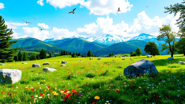Beautiful meadow with wildflowers and trees against a mountain backdrop, representing nature, peaceful landscapes, and outdoor scenic beauty.