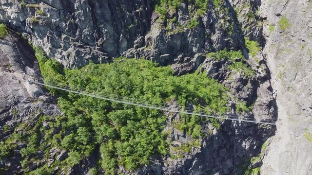 Crazy spectacular bridge over gorge at Via Ferrata route to mountain Hoven in Loen Norway - Aerial