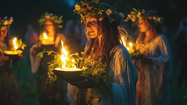 Beltane Enchanting summer solstice celebration with women holding candlelit bowls in nature