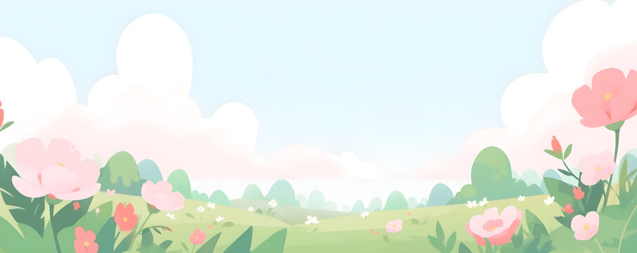 Cheerful nature landscape with copy space. Banner with spring, summer flowers field. Panoramic kids flat illustration of meadow with wildflowers on a background of mountains, blue sky and clouds.