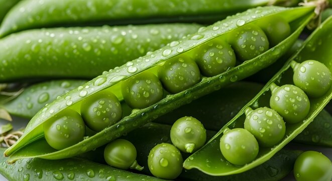 Two open pea pods filled with fresh green peas, glistening with water droplets, showcasing natures bounty