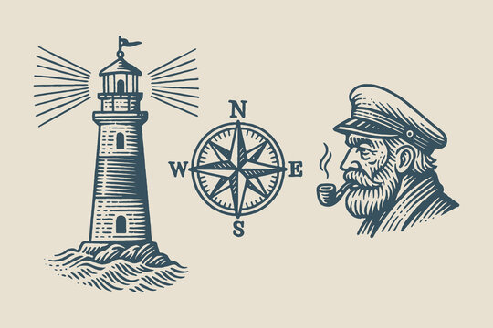 A collection of hand-drawn vintage nautical and adventure elements including a compass, rope, sailboat, anchor, ship wheel, treasure map, lantern, and binoculars, isolated on white background