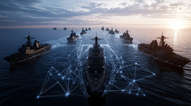 A high-tech naval concept showing a digital network overlay on the ocean with warships silhouetted against the horizon.