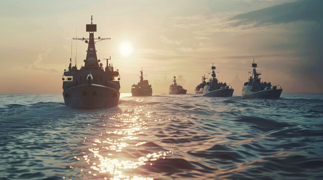 Naval fleet advancing through serene seas at twilight, sun kissing the horizon.