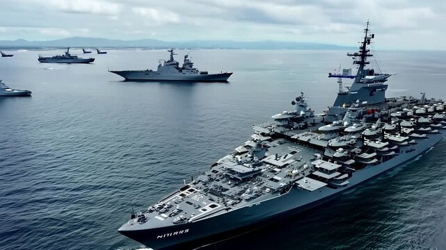 Naval vessels participate in complex military exercise in open waters under overcast skies