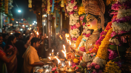 Navaratri festival, a huge idol of Goddess Durga adorned with colorful flowers and golden clothes, crowds of devotees carrying offerings while lighting oil lamps around it, Ai generated images