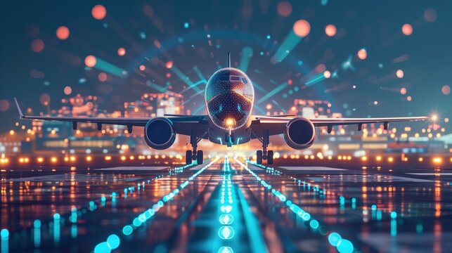 Takeoff of an airplane on an airport runway, air transport navigation Innovative airplane travel concept future technology Cargo travel on night flights
