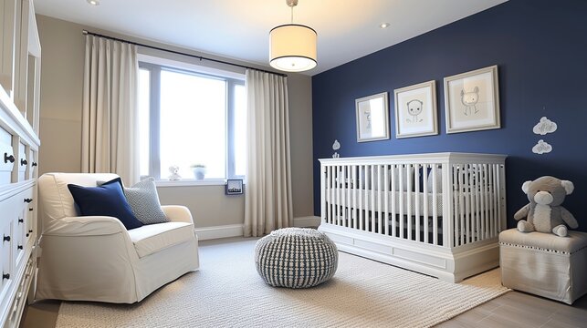 Navy blue accent wall in a cream nursery with cream furniture and navy blue accents.