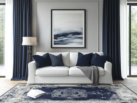 A cozy living room with navy blue accents.