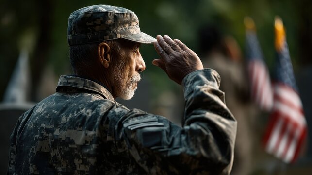 candid photograph of a veteran saluting at a cemetery , medium shot , in a military graveyard with flags