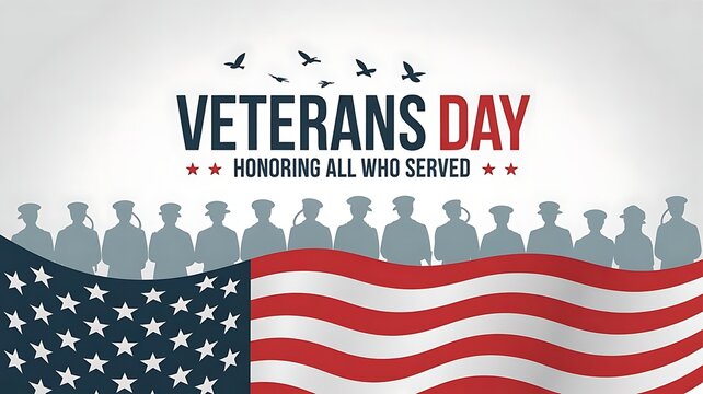 Veterans Day banner with American flag, saluting soldier silhouettes, gold stars, and “Honoring All Who Served” text. Patriotic USA holiday background. Vector illustration.