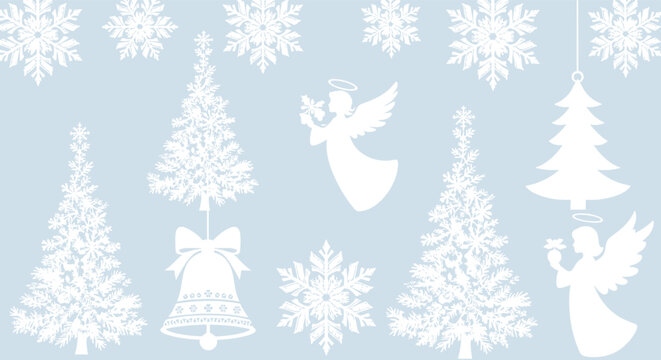 A collection of delicate white Christmas-themed silhouettes including snowflakes, pine trees, angels, and a bell set against a soft light blue background.