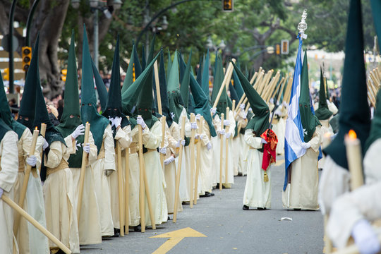 Nazarenes of the brotherhood of the Our Lady of Hope (Esperanza) of Triana. Procession of Holy Week (Semana Santa) in Seville.